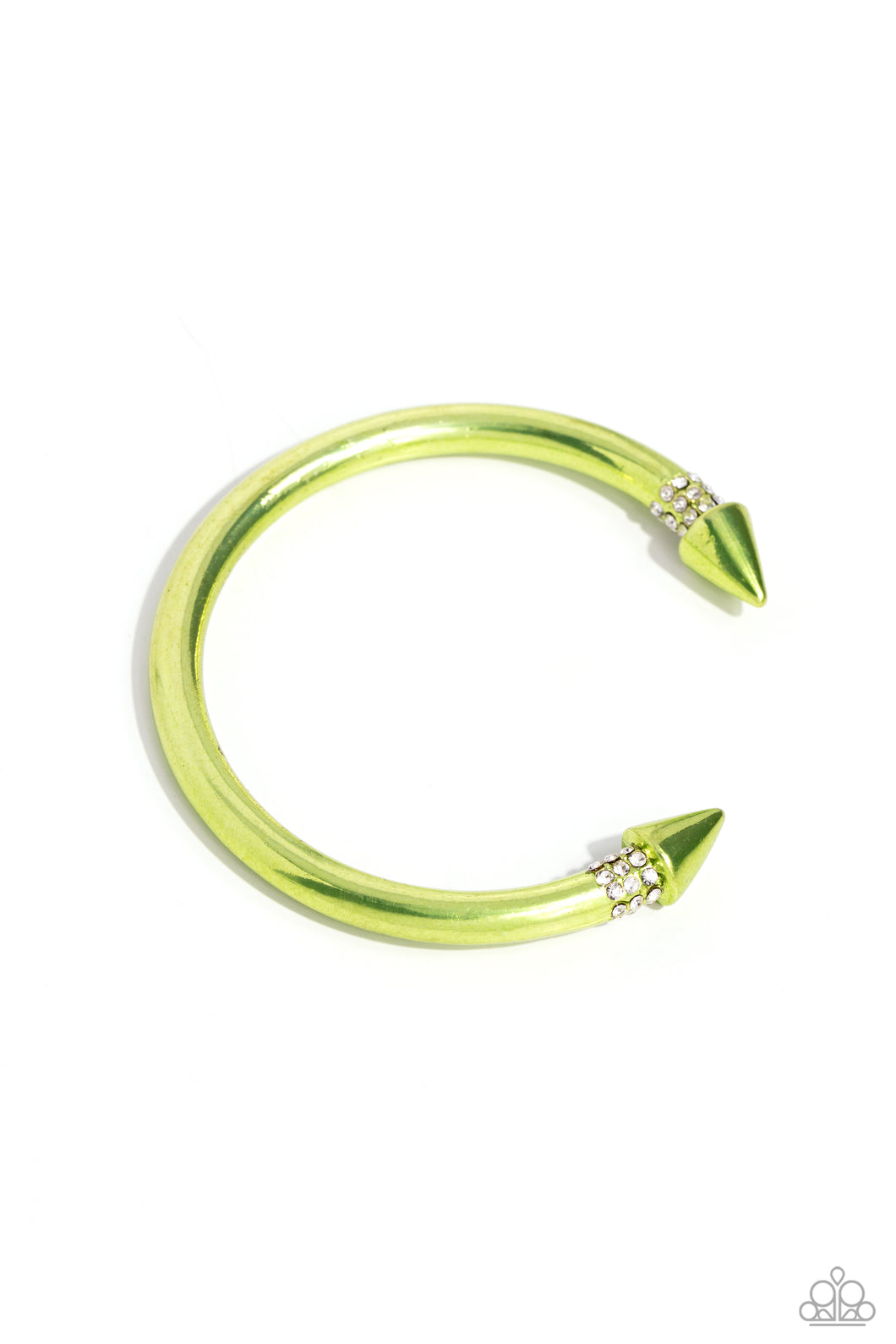 Featuring a dusting of rows of white rhinestones, a metallic green-hued cuff with tactile spikes meeting at the center of the wrist glimmers for a seasonal look.
